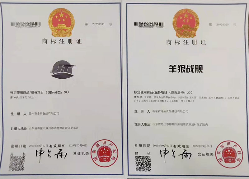 商標注冊證 商標注冊證 營業執照 食品生產許可 食品生產許可 質量管理體系認證證書